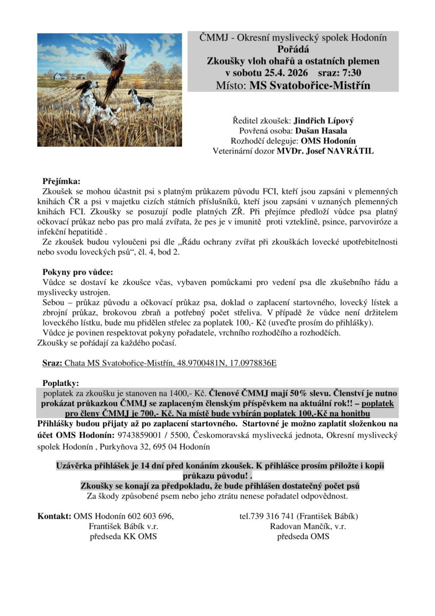 Zkoušky vloh ohařů a ostatních plemen 25. 4 .2026 MS Svatobořice - Mistřín